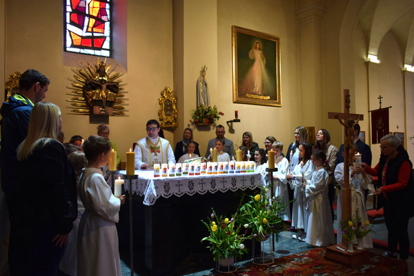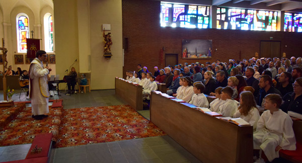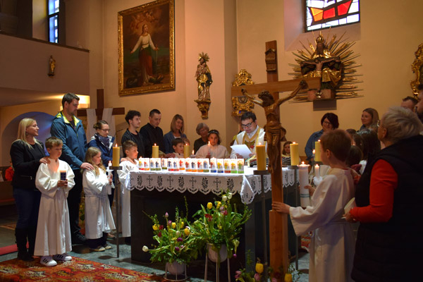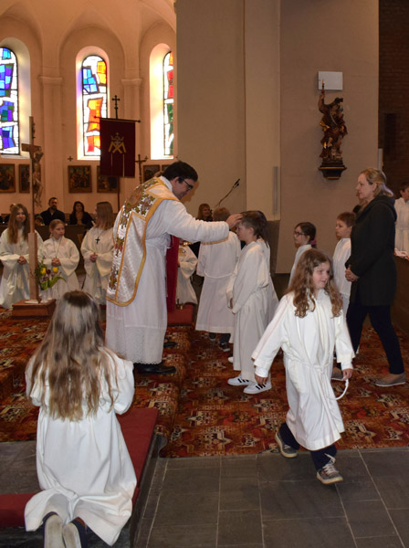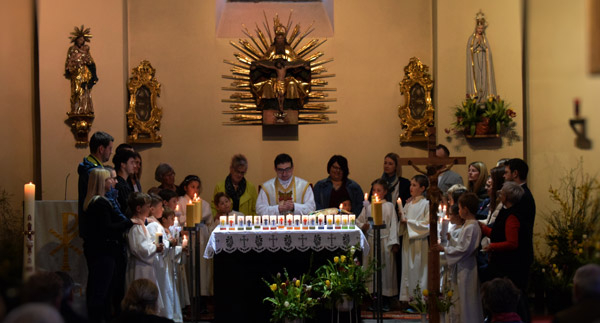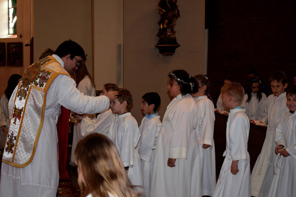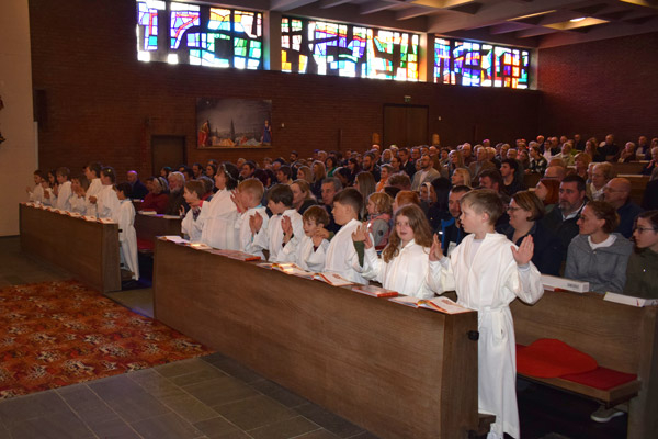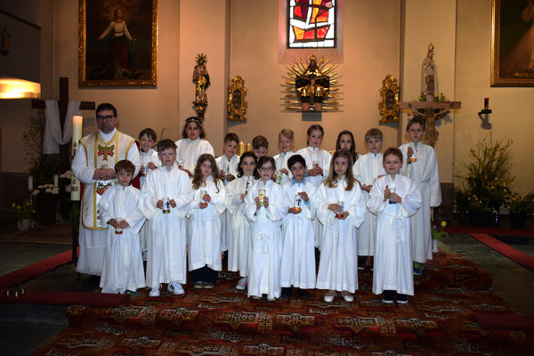 Denn dieser Gottesdienst war ein wichtiger Meilenstein bei der Vorbereitung auf das große Fest der Erstkommunion: An diesem Tag erneuerten die Kinder ihr Taufversprechen, das die Eltern und Paten bei der Taufe für sie gesprochen hatten. In ihren weißen Kleidern antworteten die Kinder laut und mit Begeisterung auf die grundlegenden Glaubensfragen: