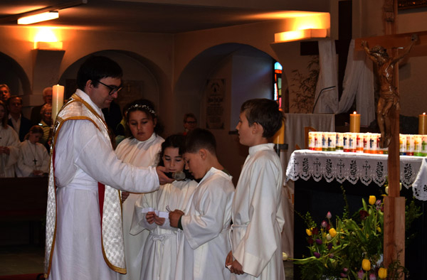 Es war schön zu sehen und zu spüren, mit welcher Freude die Kinder mitbeteten und mitsangen. Auch Pfarrer Maximilan erkannte diese Begeisterung bei diesem Gottesdienst, aber auch bei den Vorbereitungsstunden. Und er bat die Eltern, die Kinder zu unterstützen, damit diese Freude am christlichen Glauben über den Tag der Erstkommunion hinausgehe. Es wäre doch schön, wenn viele von den Erstkommunionkindern bald als Ministranten am Altar stehen würden, so wie bei dieser Hl. Messe bei der Erneuerung ihres Taufversprechens und beim „Vater unser“.