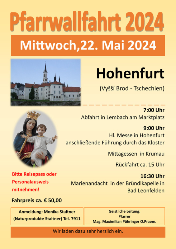 9:00 Uhr. Hl. Messe in Hohenfurt. Anschließend Führung durch das Kloster