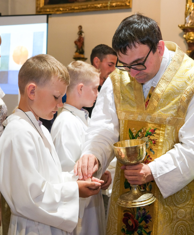 Bei einer Vorbereitungsstunde hatte Pfarrer Maximilian den Kindern auch den Kirchenraum erklärt und die Kinder hatten gut aufgepasst konnten sich noch an vieles erinnern: an den Altar, den Ambo und an den wichtigsten Ort in der Kirche…ein schwieriges Wort: Tresor? Gar nicht so falsch, denn an diesem Ort ist der Wertvollste, das wir haben, die heilige Kommunion, aufbewahrt. Und dieser Ort heißt Tabernakel.