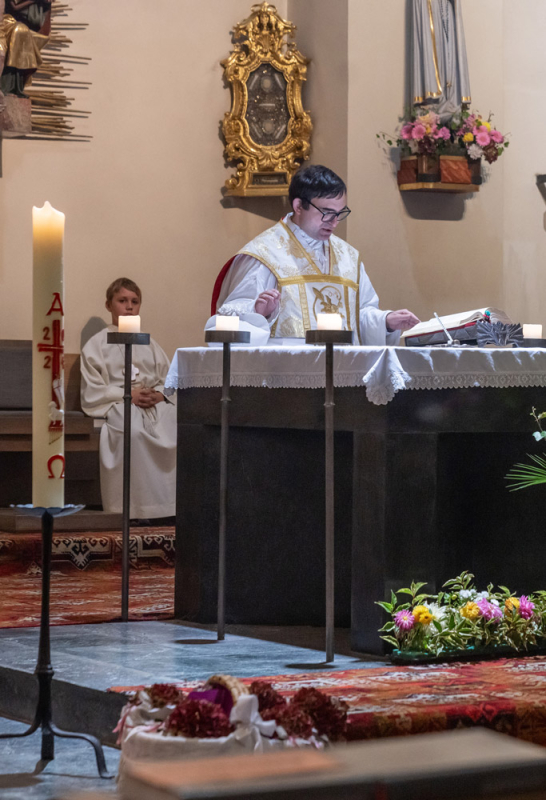 Pfarrer Maximilian fand in seiner Predigt eine Antwort auf diese Frage. Er verglich die Ehe mit einem Haus, dem Haus der Ehe. Und so, wie ein Haus auch nur bestehen kann, wenn es auf einem guten Fundament steht, so kann eine Ehe auch nur gelingen, wenn sie auf einem guten Fundament aufgebaut ist. Und so wie an einem Haus immer wieder ausgebessert und renoviert werden muss, so muss auch an der Ehe das ganze Leben lang gearbeitet werden.