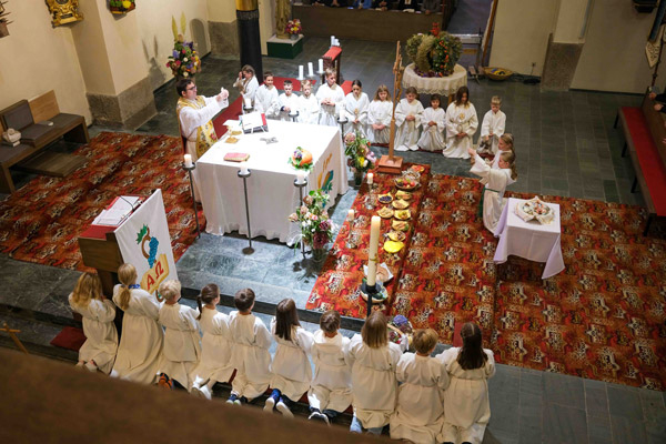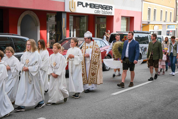 Pfarrer Maximilian, die große Ministrantenschar und der Kirchenchor gaben dem Gottesdienst einen festlichen Rahmen, die Kindergartenkinder, alle Vereine und die Pfarrbevölkerung feierten mit. Es war schön, dass an diesem Festtag die Kirche bis auf den letzten Platz gefüllt war und alle kräftig mitbeteten und mitsangen bis zum Schlusslied „Großer Gott, wir loben dich“, als Dank gegenüber Gott, der uns in diesem Jahr wieder so reich beschenkt hat - mit der Ernte des Jahres und mit der Ernte des (Ehe)Lebens.