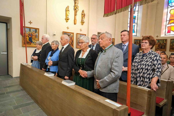 Dieser Tag war aber auch ein Tag der Freude. Wie könnten dieser Dank und diese Freude schöner zum Ausdruck kommen als durch das Läuten der Kirchenglocken? Und so zogen in einem großen Festzug begleitet vom Läuten der Glocken mit Musikkapelle, Feuerwehr, Kameradschaftsbund und Goldhaubenfrauen die Jubelpaare des heurigen Jahres und die Jungbauern mit der Erntekrone in die Kirche ein.