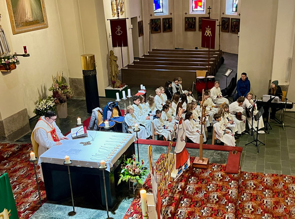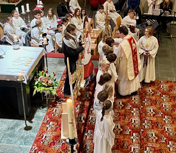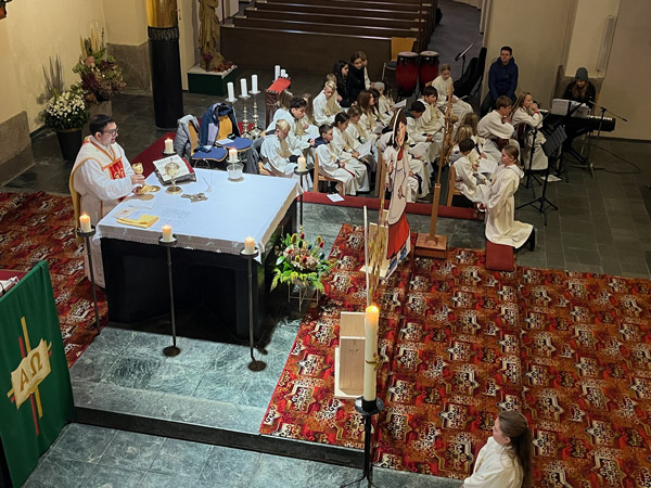 Bei uns in Lembach war jedoch zusätzlich ein besonderer Festtag! Spätestens beim Einzug von Pfarrer Maximilian zur Festmesse konnte es jeder Messbesucher sehen: die große Schar von Ministranten, die sich um den Altar versammelte. 11 neue Ministranten wurden offiziell in ihr „Amt“ eingeführt. Sie hatten ja schon seit der Erstkommunion im Frühjahr fleißig ministriert, doch nun bekamen sie feierlich ein Holzkreuz überreicht - ein Kreuz, in das ihr Name eingraviert ist, das gesegnet wurde und das sie nun bei jeder Heiligen Messe umgehängt haben, als Zeichen dafür, dass sie nun wahre Diener am Tisch Jesu sind.