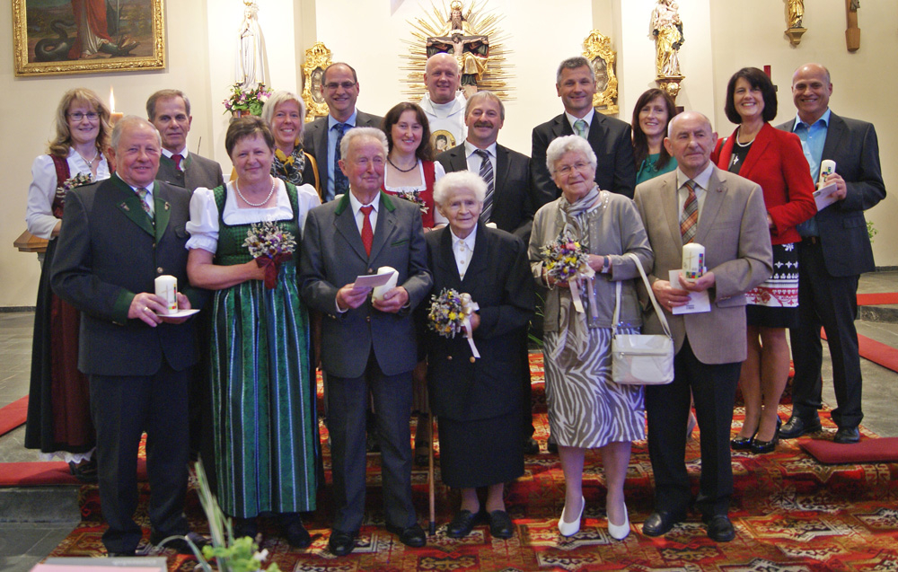 Viele haben mitgeholfen, dass diese Feier der Jubelpaare wieder ein so schönes Fest für die ganze Pfarrgemeinde wurde: die Goldhaubenfrauen, die die Blumensträußchen gebastelt haben. Sie geleiten die Jubelpaare in die Pfarrkirche und organisieren jedes Jahr eine gesellige Agape vor dem Pfarrheim. Die Frauen der Katholischen Frauenbewegung überreichten den Jubelpaaren schön verzierte Kerzen. Der Kirchenchor unter der Leitung von Frau Ilse Hammer, das Bläserensemble der Musikkapelle und Nicki Leitenmüller gestalteten die Hl.Messe musikalisch. Ein herzliches „Vergelt’s Gott!“ Großer Dank auch Pfarrer Kasimir, der mit seinen treffenden Worten bei der Predigt uns allen wieder gesagt hat: „Gott mit uns auf allen Wegen.“