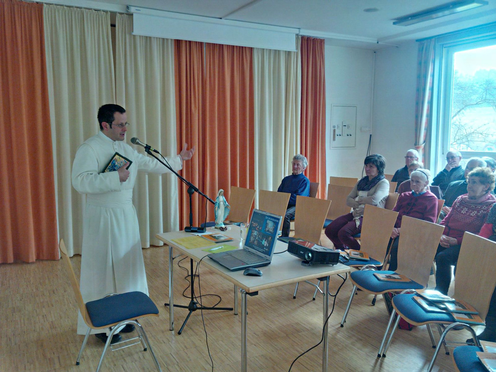Pater Vinzenz Ecker verstand es sehr gut, die Teilnehmer des Einkehrtages in Lembach am 14. März mit seinen Vorträgen zu begeistern. Die zentrale Frage „Wer ist Gott (für mich)“ beantwortete er mit gut ausgesuchten Bibelstellen und Beispielen von Personen aus der Bibel. Die gute Mischung aus sachlicher Information und geistlicher Impulse half sicher vielen Teilnehmern, dem eigenen Glauben wieder auf die Spur zu kommen und ihn zu vertiefen.