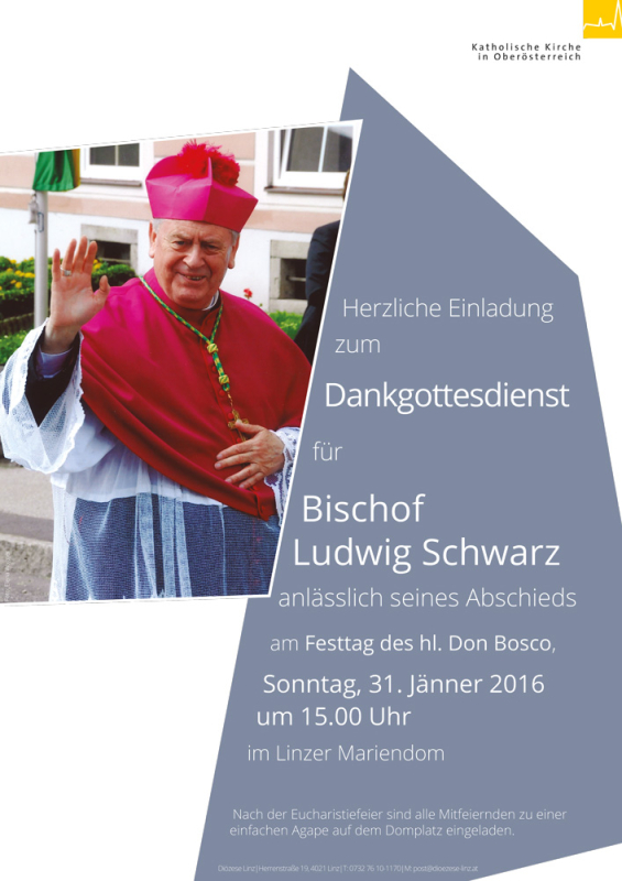 Dr. Ludwig Schwarz, Salesianer Don Boscos, hat am 18. September 2005 das Amt des Bischofs von Linz übernommen. Mehr als zehn Jahre hat er die Diözese umsichtig geleitet. Anlässlich seines Abschieds möchten wir Ludwig Schwarz bei einem Festgottesdienst im Linzer Mariendom für sein Wirken und seinen Hirtendienst aufrichtig danken.