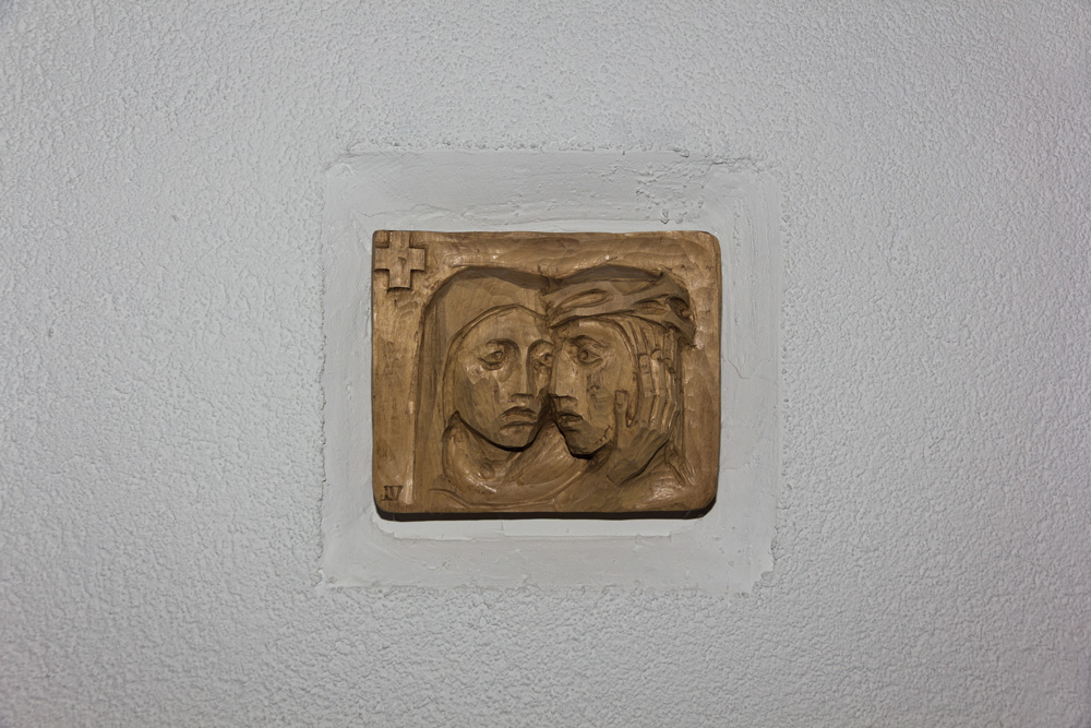 Die Mutter steht am Weg, den der Sohn mit seinem schweren Kreuz geht. Ihre Blicke begegnen sich. Sie erkennt seine Qual und trägt alles Leid mit ihm.