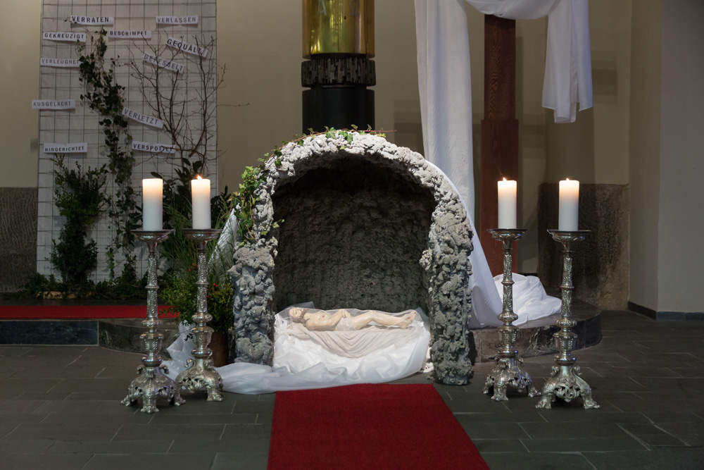 Um 15:00 Uhr, zur Todesstunde Jesu, versammeln wir uns zur Karfreitagsliturgie mit Verlesung der Passion, zur Kreuzverehrung und zur anschließenden Kommunionfeier.