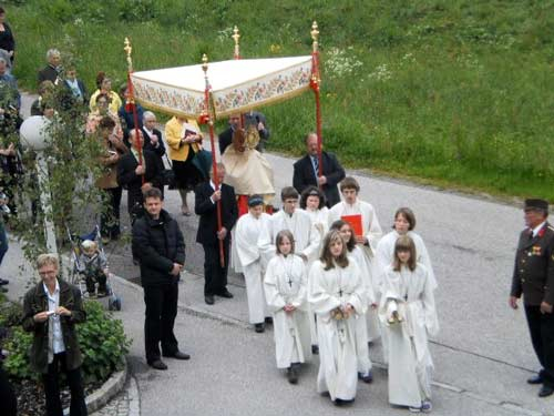 Zu Fronleichnam ehren wir Jesus Christus in der Prozession durch die Straßen durch die schön geschmückten HÁ¤user und AltÁ¤re, durch die schönen Kleider und Uniformen, die bei den AltÁ¤ren gestreuten Blumen, durch Musik, unseren Gesang und unser Gebet. Und Jesus zeigte uns, dass wir ihn brauchen und dass es wichtig ist, dass wir ihn durch unsere Straßen tragen und ehren, weil er trotz der schlechten Wetterprognosen wÁ¤hrend der Prozession den regen fernhielt und sogar einen kurzen Sonnenstrahl schickte! Danke!