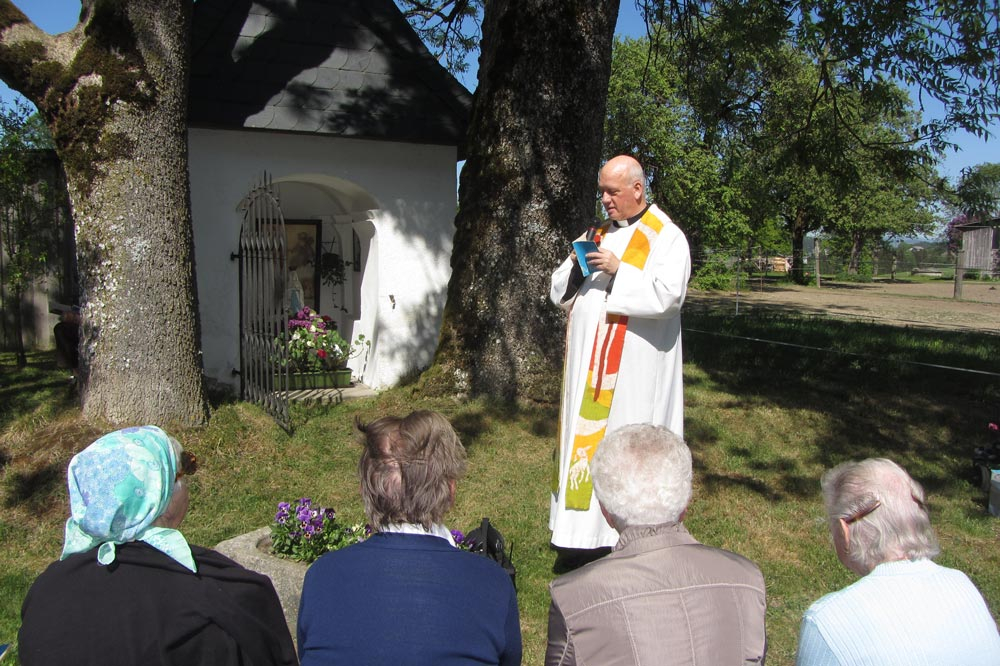 An Sonn- und Feiertagen feiern wir die Maiandachten bei den Kapellen und Bildstöcken im Pfarrgebiet. Die erste dieser Maiandachten war bei der Kapelle der Familie Ecker, Feichten.