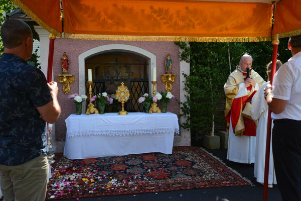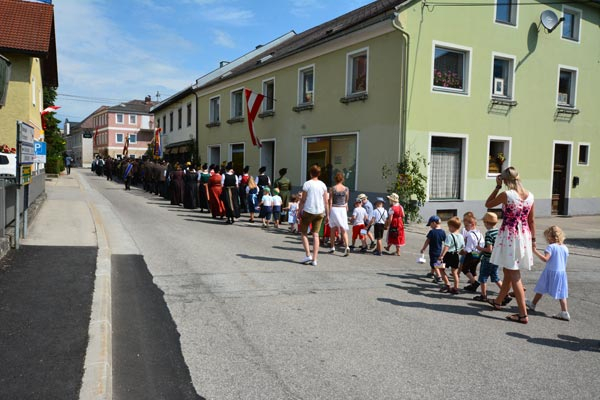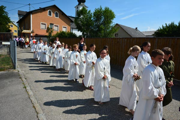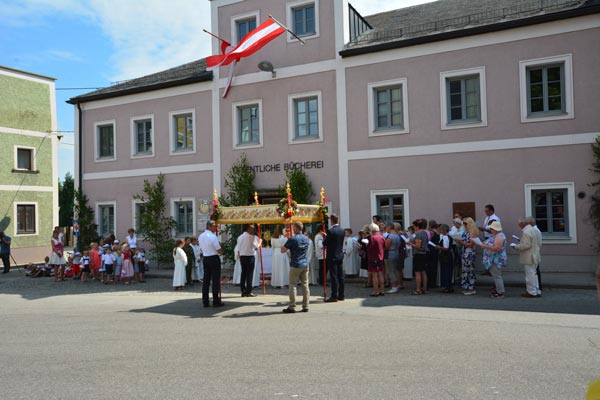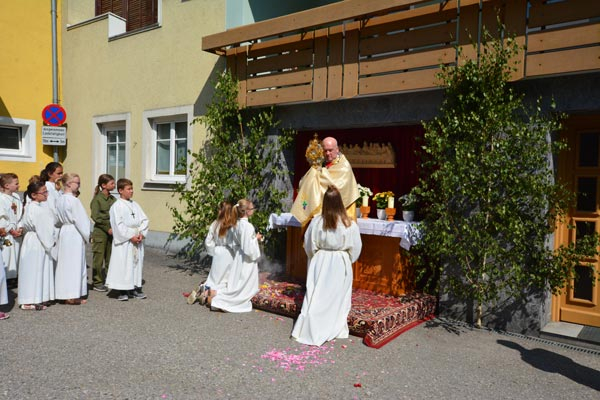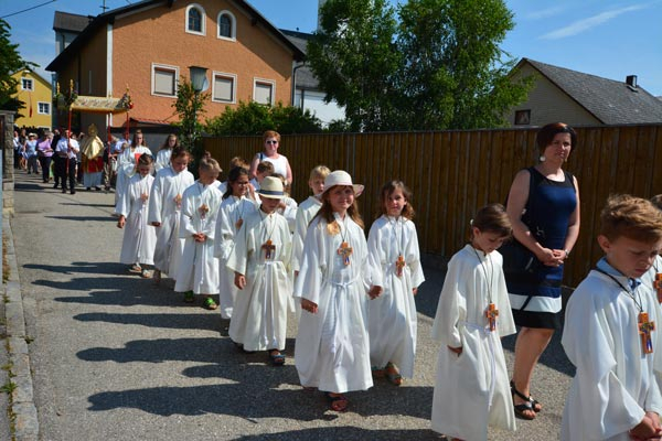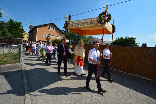 Viele haben den Weg, auf dem Er durch Lembach gegangen ist, bereitet und geschmückt: die Altäre bei Familie Ensbrunner, bei der Bruderschaftskapelle, beim Gemeindeamt und beim Gemeindehaus am Marktplatz. Der Weg wurde mit Birken, Blumen, Fahnen, Bildern und Kerzen geschmückt. So konnte Pfarrer Kasimir Jesus Christus in der Gestalt des Brotes durch die Straßen Lembachs tragen.