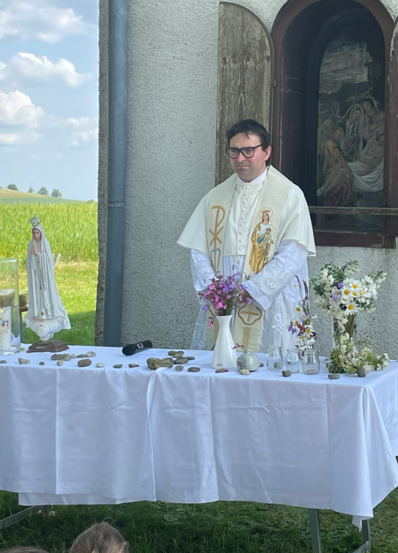 Das Team Kinderkirche gestaltete mit Pfarrer Maximilian eine Kinder- und Familienmaiandacht bei der Mühlholzkapelle.