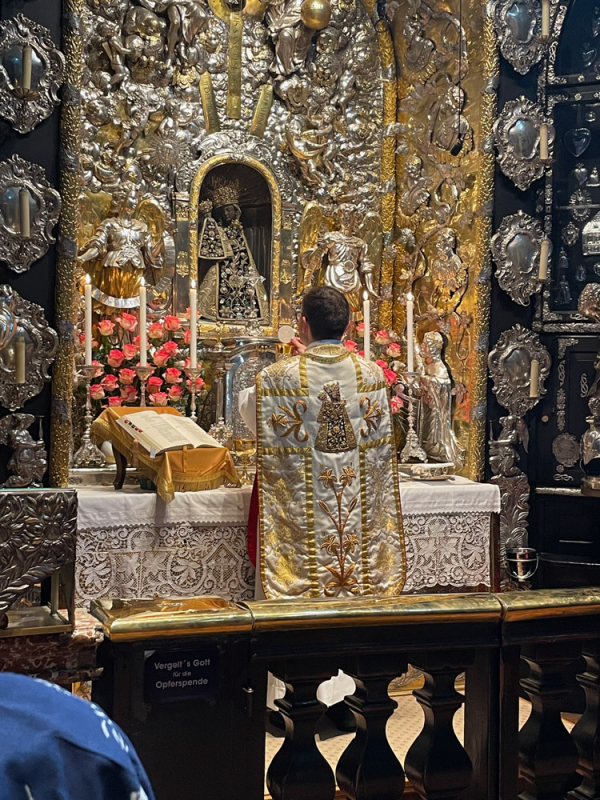 Der Besuch bei der Gnadenmutter in Altötting war unser erstes Ziel, ganz besonders aus der Sicht einer neuen Glaubenserfahrung. Pfarrer Maximilian verglich unseren Besuch an diesem Gnadenort mit dem Besuch von Maria bei ihrer Cousine Elisabeth. Wie für Maria damals, so soll ein Besuch eine Ermunterung zur Begegnung, zur Gastfreundschaft und zur Heiligkeit sein. Es soll uns zu denken geben, dass in der heutigen Zeit diese drei Aspekte leider oft in Vergessenheit geraten oder nicht „modern“ sind. Doch in der Begegnung mit Gott, in der Gastfreundschaft und in der Heiligkeit, nicht nur für Priester und Ordensleute, sondern für uns alle, sollte Maria uns ein Vorbild sein.
