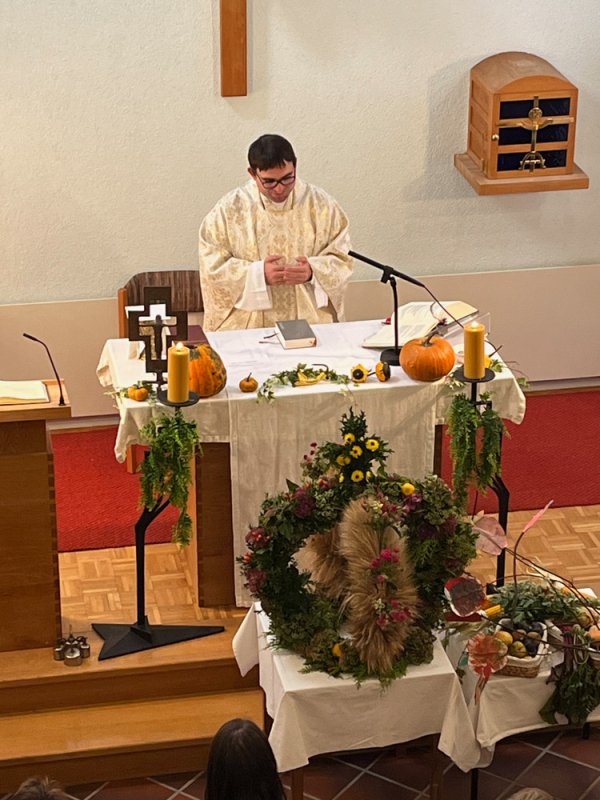 Am 27. September 2023 feierte Pfarrer Maximilian mit den Bewohnern des Altenheimes, mit vielen auswärtigen Messbesuchern und mit den Kindern und Betreuerinnen der Krabbelstube des Altenheimes „Villa Kunterbunt“ das Erntedankfest.