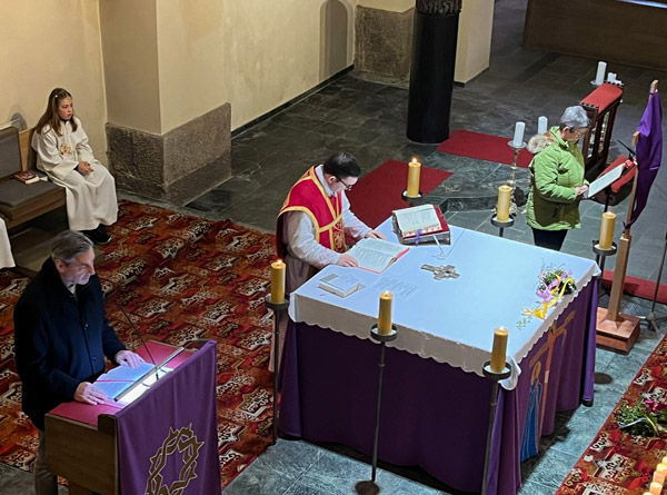 So wie die Menschen in Jerusalem bereiteten auch die Lembacher Jesus einen herzlichen Empfang und zogen mit ihren Palmbuschen in die Kirche ein. Doch die Leidensgeschichte, die dann in der Kirche gelesen wurde, erinnerte uns daran, dass der Jubel schnell vorbei war und in Ablehnung, Zorn und Wut und dann in Trauer umschlug.