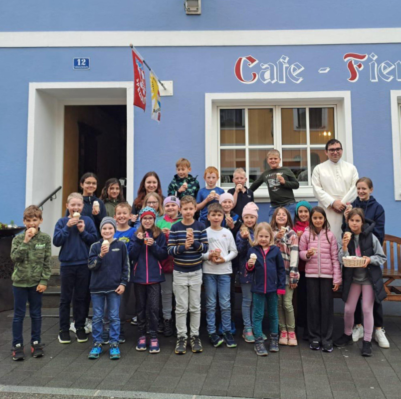 Pfarrer Maximilian lud die Erstkommunionkinder und die Ministranten zum Eisessen ins Caféhaus ein - als Dankeschön für’s Mitfeiern und Mitgehalten des Fronleichnamsfestes.