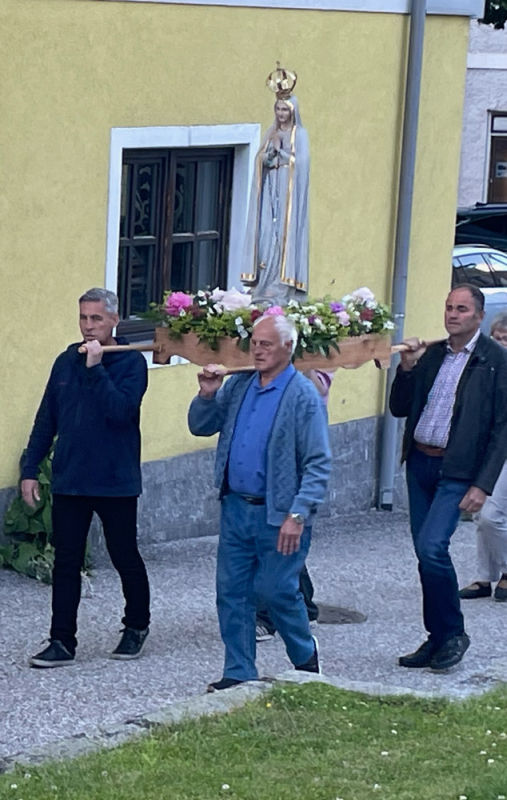 So viele Marienverehrerinnen und -verehrer waren zu dieser Fatimafeier gekommen und bei der Lichterprozession rund um die Kirche sangen alle beim Fatimalied kräftig mit: „Ave, ave, ave Maria!“ , sei gegrüßt, so wie der Erzengel Gabriel Maria grüßte, bevor er sie segnete und ihr die Botschaft überbrachte, dass sie die Mutter des Sohnes Gottes werden solle.