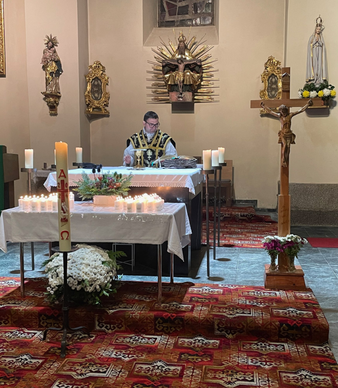 Die Mitarbeiter des Altenheimes hatten für diesen Gottesdienst Fotos der Verstorbenen und für jeden von ihnen einen Gedenkkerze vorbereitet, die an der Osterkerze entzündet wurde. Musikalisch umrahmt wurde der Gedenkgottesdienst vom Kirchenchor und Pfarrer Maximilian konnte bei seiner Predigt Trost und Zuversicht spenden: Unsere Verstorbenen werden gehalten von Gottes Hand.