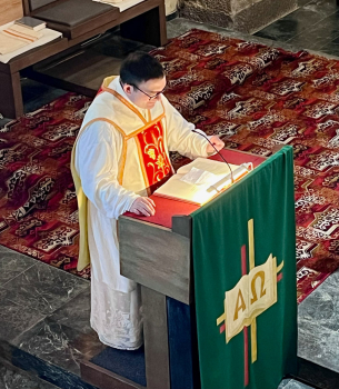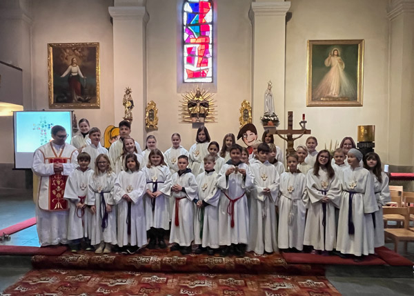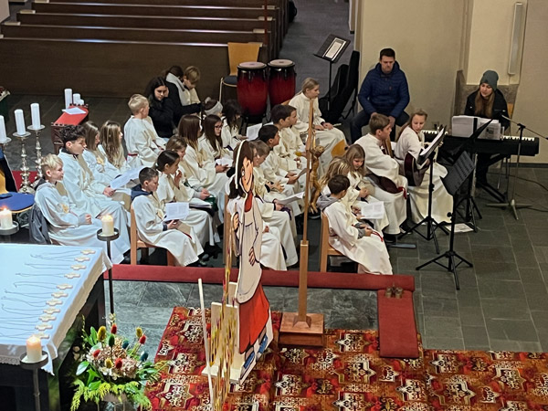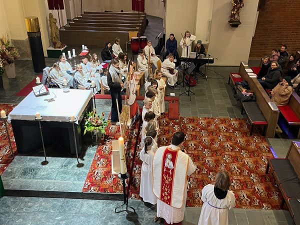 Bei uns in Lembach war jedoch zusätzlich ein besonderer Festtag! Spätestens beim Einzug von Pfarrer Maximilian zur Festmesse konnte es jeder Messbesucher sehen: die große Schar von Ministranten, die sich um den Altar versammelte. 11 neue Ministranten wurden offiziell in ihr „Amt“ eingeführt. Sie hatten ja schon seit der Erstkommunion im Frühjahr fleißig ministriert, doch nun bekamen sie feierlich ein Holzkreuz überreicht - ein Kreuz, in das ihr Name eingraviert ist, das gesegnet wurde und das sie nun bei jeder Heiligen Messe umgehängt haben, als Zeichen dafür, dass sie nun wahre Diener am Tisch Jesu sind.