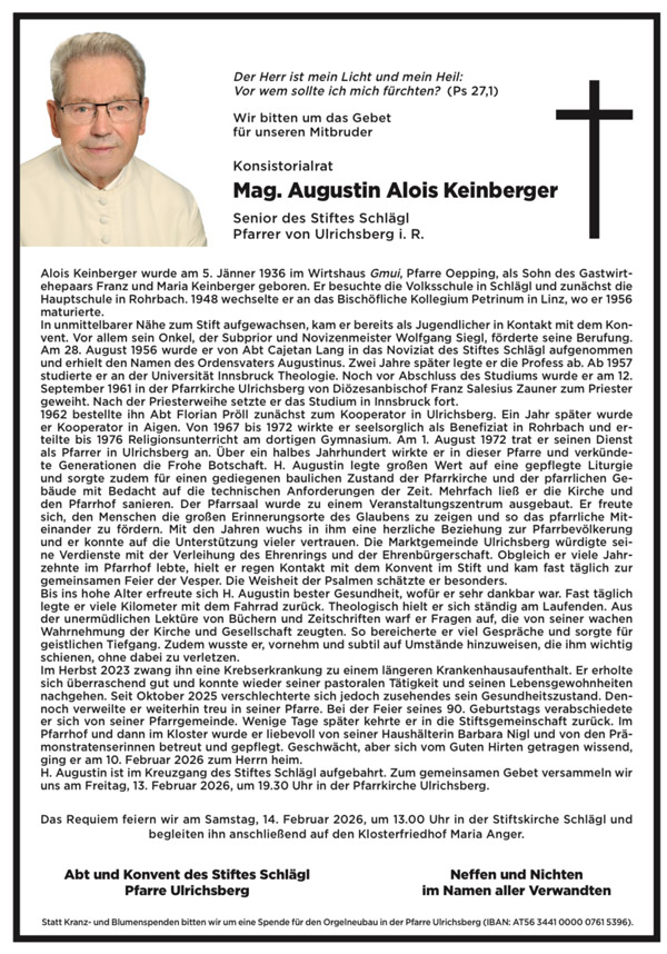 Herr Augustin ist im Kreuzgang des Stiftes Schlägl aufgebahrt. Zum gemeinsamen Gebet versammeln wir uns am Freitag, den 13. Februar 2026 um 19:30 Uhr in der Pfarrkirche Ulrichsberg.
