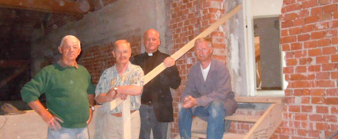 Zwischen Pfarrheim und Kirchendachboden war seit der Bauzeit nur ein provisorischer, "eiserner" und etwas gefährlicher Übergang. Auf Initiative von Hubert Schinkinger begannen Herbert Wakolbinger und Johann Pamminger mit dem Bau einer stabilen Holztreppe. Nach Fertigstellung wurde Pfarrer Kasimir zur Übergabe bzw. Erstbegehung eingeladen. Er war sehr überrascht und hat die drei Kameraden sogleich auf ein Getränk eingeladen.
