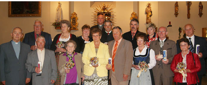 Viele haben mitgeholfen, dass diese Messe allen in schöner Erinnerung bleiben wird: Pfarrer Kasimir und Pfarrer Johann Altendorfer zelebrierten die Messe und gaben allen Jubelpaaren einen Rosenkranz, der Kirchenchor mit Chorleiterin Ilse Hammer, ein Bläserensemble spielte während der Heiligen Messe und bei der Agape, die Frauen der Goldhaubengruppe überrreichten den Jubelpaaren ein Trockenblumensträußchen und luden die Jubelpaare zu einer Agape ins Pfarrzentrum ein, und die Vertreterinnen der Katholischen Frauenbewegung Lembach hatten für die Jubelpaare Kerzen verziert. Allen ein herzliches „Vergelt’s Gott!“