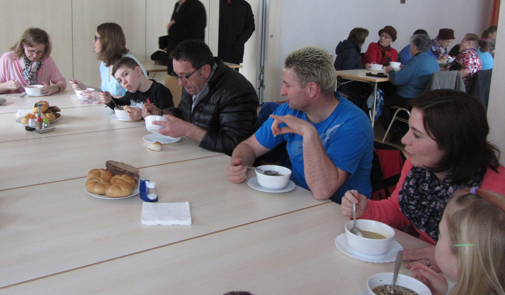 Keine Chance für einen Suppenkasper: den köstlichen Suppen, die die Frauen der Katholischen Frauenbewegung Lembach heuer anboten, konnte keiner widerstehen. Viele verschiedene Suppen standen am Speiseplan und alle schmeckten vorzüglich. Neben dem kulinarischen Genuss und dem gesellschaftlichen Aspekt –in einer größeren Gesellschaft schmeckt das Essen noch besser- stand natürlich der eigentliche Sinn des Suppensonntags im Vordergrund: Suppe essen für einen guten Zweck. Und es hat sich ausgezahlt! 500 Euro konnten aus dem Erlös des Suppensonntags für die Aktion Familienfasttag 2015 überwiesen werden. Ein herzliches „Vergelt’s Gott!“