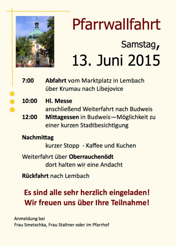 Wir laden alle Lembacherinnen und Lembacher, Männer und Frauen, Ehepaare und interessierte Jugendliche zu unserer Pfarrwallfahrt am Samstag, den 13. Juni 2015 sehr herzlich ein. Um auch allen Berufstätigen die Teilnahme an der Wallfahrt zu ermöglichen, haben wir heuer den Termin an einem Samstag gewählt.