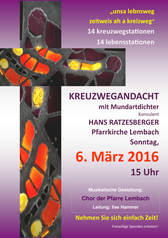 Wir laden sehr herzlich zur Kreuzwegandacht mit Mundartdichter Hans Ratzesberger ein. Musikalisch umrahmt wird die Andacht vom Chor der Pfarre Lembach unter der Leitung von Ilse Hammer.