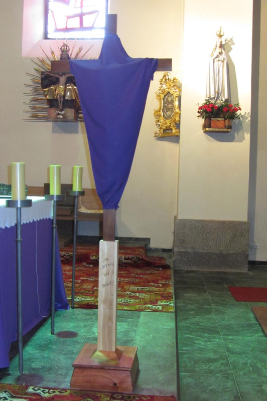 Ab dem Passionssonntag wird das Kreuz in der Kirche verhüllt. Warum verhüllt man ausgerechnet in der Zeit das Kreuz, in der es doch um das Kreuz und die Kreuzigung geht? Pfarrer Kasimir gab in der Sonntagspredigt eine gute Erklärung: Ganz besonders in den letzten Tagen der Fastenzeit soll uns die Bedeutung des Leidens und Sterbens Jesu Christi bewusst werden. Wenn nun in dieser Zeit das Kreuz mit dem gekreuzigten Jesus verhüllt ist, können wir es zwar nicht mit den Augen sehen, wir haben aber nun die Möglichkeit, die Bedeutung und den Sinn des Leidens mit unseren Herzen und mit unserer Seele zu erfassen.