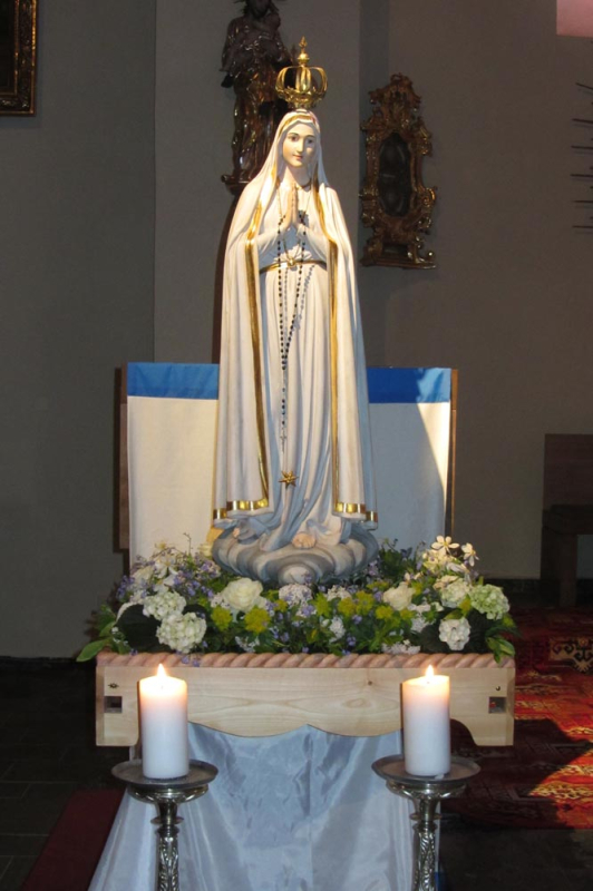 Am 13. Mai, dem ersten Erscheinungstag der Gottesmutter feierten wir eine Festmesse in der Pfarrkirche. Im Anschluss daran trugen wir unsere Fatimamuttergottes auf einem mit Blumen schön geschmückten Podest rund um die Pfarrkirche – begleitet von vielen Muttergottesverehrern, mit Kerzen und das Fatimalied singend: Ave, ave, ave Maria!