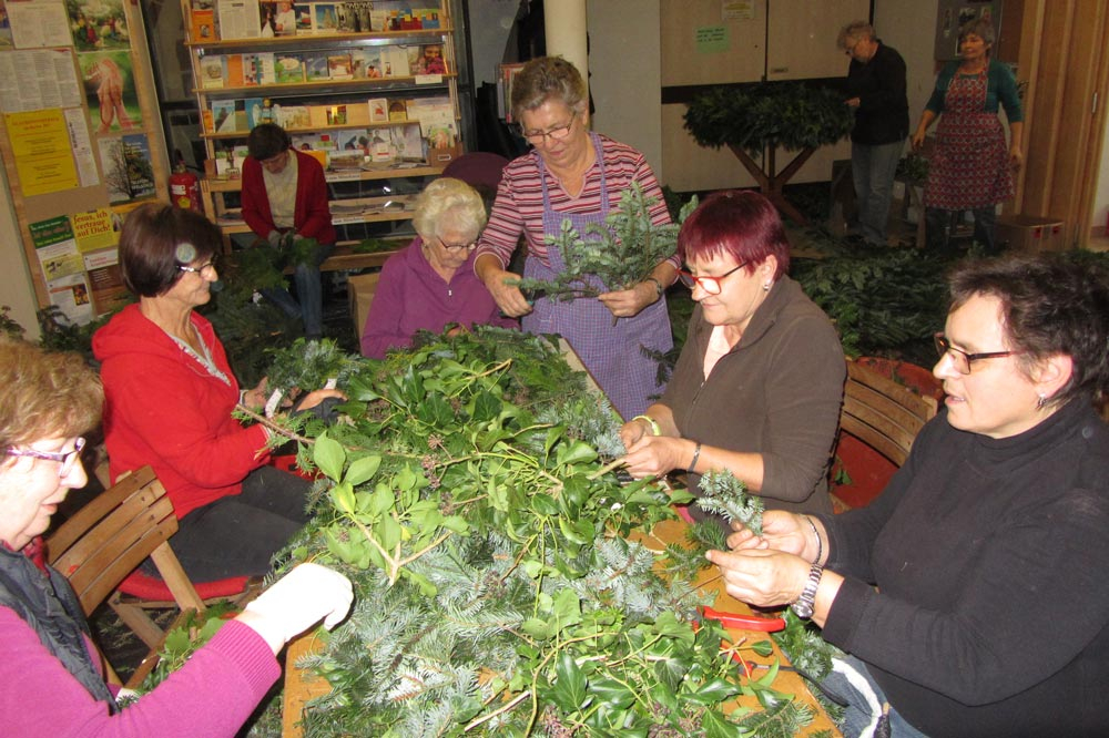 Für die Frauen der Katholischen Frauenbewegung gehört dieser Termin schon zu einem Fixpunkt im Arbeitsjahr: das Binden der Adventkränze. Dabei geht es nicht nur um ein geselliges Beisammensitzen beim Binden der Kränze, um Tannenduft und Tee und Krapfen nach der Arbeit. Die Frauen der KFB bringen mit ihren Adventkränzen Licht in die Herzen der Lembacher und Licht in die Herzen der Menschen in den Missionsländern: der Erlös aus dem Verkauf der Kränze wird so wie in jedem Jahr für Projekte in den Missionsländern gespendet.