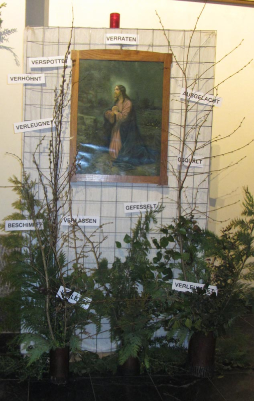 Nach dem gemeinsamen Abendmahl gehen Jesus und seine Jünger zum Ölberg, an dessen Fuß der Garten Getsemani liegt. Das Bewusstsein des drohenden Todes trifft Jesus mit voller Wucht. Doch er nimmt sein Schicksal an: „Herr, nicht mein Wille, sondern Dein Wille geschehe!“