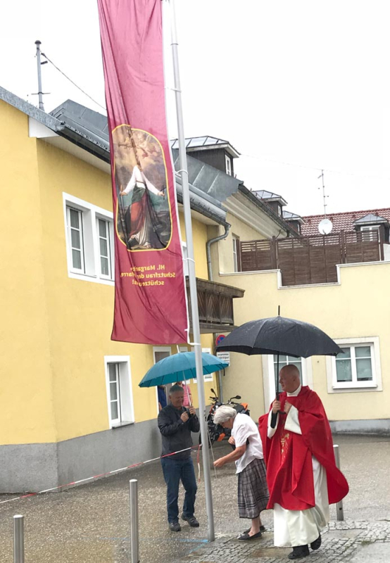 Doch heuer gab es am Tag des Patroziniums trotzdem für viele wieder eine Überraschung: vier Margaritafahnen wurden geweiht und gehisst. Sie tragen die Botschaft unserer Pfarrpatronin nun hinaus zu allen Lembachern: